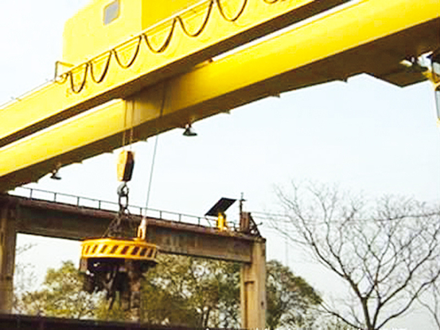 電磁橋式起重機的基本構造與吊鉤橋式起重機相同,不同的是吊鉤上掛1個直流起重電磁吸盤,用來吊運具有導磁性的黑色金屬及其制品。通過裝在司機室內的可控硅直流箱將交流電源轉換為直流電源,然后再通過設在小車上的專用電纜卷筒,將直流電源用電纜送到電磁吸盤上。