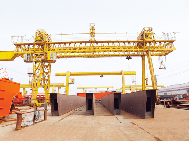 該門式起重機(jī)其主要用于橋梁建設(shè),工作速度慢,由門架、卷揚(yáng)機(jī)小車、大車運(yùn)行機(jī)構(gòu)、司機(jī)室和電氣控制系統(tǒng)組成。門架為桁架結(jié)構(gòu),具有結(jié)構(gòu)輕、抗風(fēng)力強(qiáng)等優(yōu)點。包括主梁、上端梁、支腿、下端梁、走行臺車及走臺欄桿等。主梁采用三角桁架結(jié)構(gòu),上面鋪設(shè)有軌道,供小車沿主梁方向作橫向移動。支腿采用箱形或鋼管兩種形式。小車上布置有卷揚(yáng)機(jī),體積緊湊,自重輕。