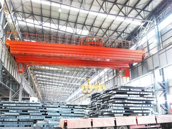 用于搬運(yùn)長(zhǎng)件板坯、棒材等黑色金屬。回轉(zhuǎn)通過(guò)兩種形式實(shí)現(xiàn),一種形式為掛梁回轉(zhuǎn),即掛梁為雙層結(jié)構(gòu),上層掛梁通過(guò)滑輪組與鋼絲繩纏繞,下層掛梁配有多臺(tái)電磁吸盤(pán)或夾鉗,可隨驅(qū)動(dòng)機(jī)構(gòu)回轉(zhuǎn)一定角度。另一種形式為小車(chē)回轉(zhuǎn),即小車(chē)為雙層結(jié)構(gòu),上層小車(chē)布置有起升機(jī)構(gòu),下層小車(chē)為運(yùn)行小車(chē),上面鋪設(shè)有環(huán)形軌道,上層小車(chē)可沿環(huán)形軌道回轉(zhuǎn)。